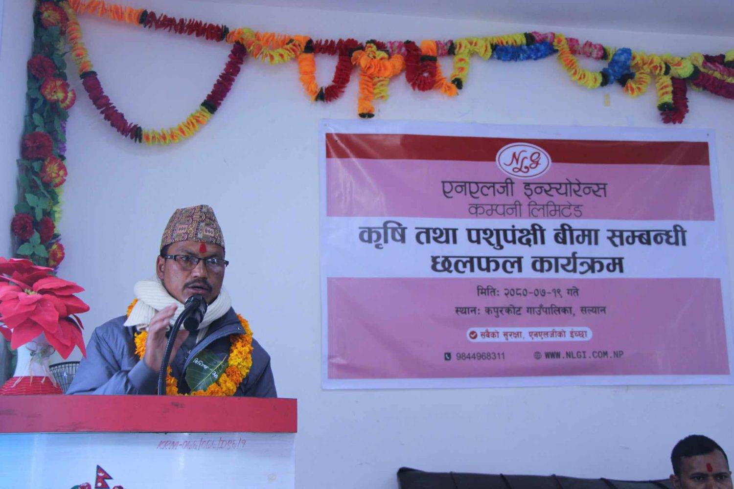 एनएलजी इन्स्योरेन्स कम्पनी लिमिटेडले सल्यानमा कृषि पशुपंक्षी बीमा सचेतना कार्यत्रम सम्पन्न गरेको छ । कम्पनीले कार्तिक १९ गते आईतबारका दिन कपुरकोट गाउँपालिकाको सभाहलमा कृषि तथा पशुपन्छी बीमा सम्बन्धी छलफल कार्यक्रम सम्पन्न गरेको हो । कम्पनीका बिजनेश कोअर्रिडिन्टर सुनील श्रेष्ठले छलफल कार्यक्रम आयोजना गर्नुको उद्धेश्य, कृषि बीमाका प्रावधान र महत्वका बारेमा जानकारी गराए ।