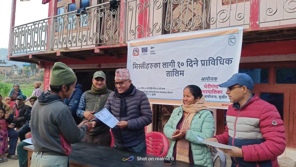 सवैका लागि दिगो खानेपानी, सरसफाई तथा स्वच्छता (सुस्वा) आयोजना अन्तर्गत मिस्त्रीहरुका लागि १०दिने तालिम सम्पन्न भएको छ । भेरीगंगा नगरपालिका अन्तर्गत सुस्वा आयोजनाको सहयोगमा हाल निर्माण चरणमा रहेका खानेपानी तथा सरसफाइ योजनाहरुबाट १० जना सक्रिय स्थानीय मिस्त्रीहरु छनौट गरी मिति २०८० पौष १२ गते देखि पौष २१ गतेसम्म भेरीगंगा नगरपालिका वडा नं २ स्थित मैनटार सनिमुल खानेपानी तथा सरसफाइ योजना क्षेत्रमा संचालन गरिएको थियो । यस अवधिमा सुस्वा परियोजनावाट उपलव्ध गराइएका प्रशिक्षकद्धय टेक हमाल तथा गमान सिह थापाले मुख्य प्रशिक्षकको रुपमा सहजीकरण गर्नको साथै भेरीगंगा नगरपालिका अन्तरगत वास इकाइमा कार्यरत कर्मचारीहरुले समेत सहजीकरण गर्नु भएको थियो । तालिम अवधिमा अति विपन्न घरधुरी छनौट गरि ५ वटा सौचालय निर्माण कार्य सम्पन्न गरिएको थियो । तालिमको अन्तिम दिन आज पौष २१ गते सो तालिमको समापन कार्यक्रम भेरीगंगा नगरपालिका वडा नं २ का वडा अध्यक्ष श्री चिरन्जीवि वुढाको अध्यक्षतामा भएको थियो भने प्रमुख अतिथि एवं नगर प्रमुख यज्ञ प्रशाद ढकाल ज्यू तथा विशिष्ठ अतिथी नगर उप प्रमुख धनसरा वोहरा ज्यू हुनुहुन्थ्यो । सो अवसरमा स्वागत मन्तव्य दिदै भेरीगंगा नगरपालिका अन्तरगत खानेपानी सरसफाइ तथा वातावरण शाखा प्रमुख श्री चित्र वहादुर के सि ले मानव जीवनको सभ्यतासंग जोडिएको विषय भएकाले विशेष ध्यान दिनु पर्ने बताउनुभयो । कार्यक्रममा शुभकामना मन्तव्य दिदै प्रमुख अतिथी एवं नगर प्रमुख ज्यूले यो तालिमले दक्ष जनशक्ती उत्पादन गरि युवा रोजगारीको शिर्जना गर्नको साथै समुदायमा प्रयोग मैत्री सौचालय निर्माण कार्यमा तिव्रता अउनको साथै पुर्ण सरसफाइ उन्मुख समुदाय हुदै पुर्ण सरसफाइ टोल घोषणा गर्न सहयोग पुग्ने बताउनुभयो । सोहि अवसरमा वोल्दै नगर उप प्रमुख एवं कार्यक्रमका विशिष्ट अतिथि ज्यूले तालिममा सहभागी व्यक्तीहरुले सौचालय निर्माण कार्यमा सहजीकरण गर्दै आ आफ्नो समुदायको साथै छिमेकी गाउँमा समेत अभियानको रुपमा संचालन गर्नु पर्ने कुरा वताउनु भयो । कार्यक्रम संचालक एवं वास संयोजक देवराज भण्डारीले समुदायलाइ पुर्ण सरसफाइ टोल घोषणा गर्न यो तालिम निकै सहयोगी सावित हुने तथा समुदायमा हाल भएका सौचालयको स्तरोन्नती र सौचालय वन्न नसकेका घरधुरीमा सौचालय निर्माण कार्यमा सहयोग भइ सुधारिएको सौचालय निर्माण कार्यले तिव्रता पाउने बताउनुभयो ।